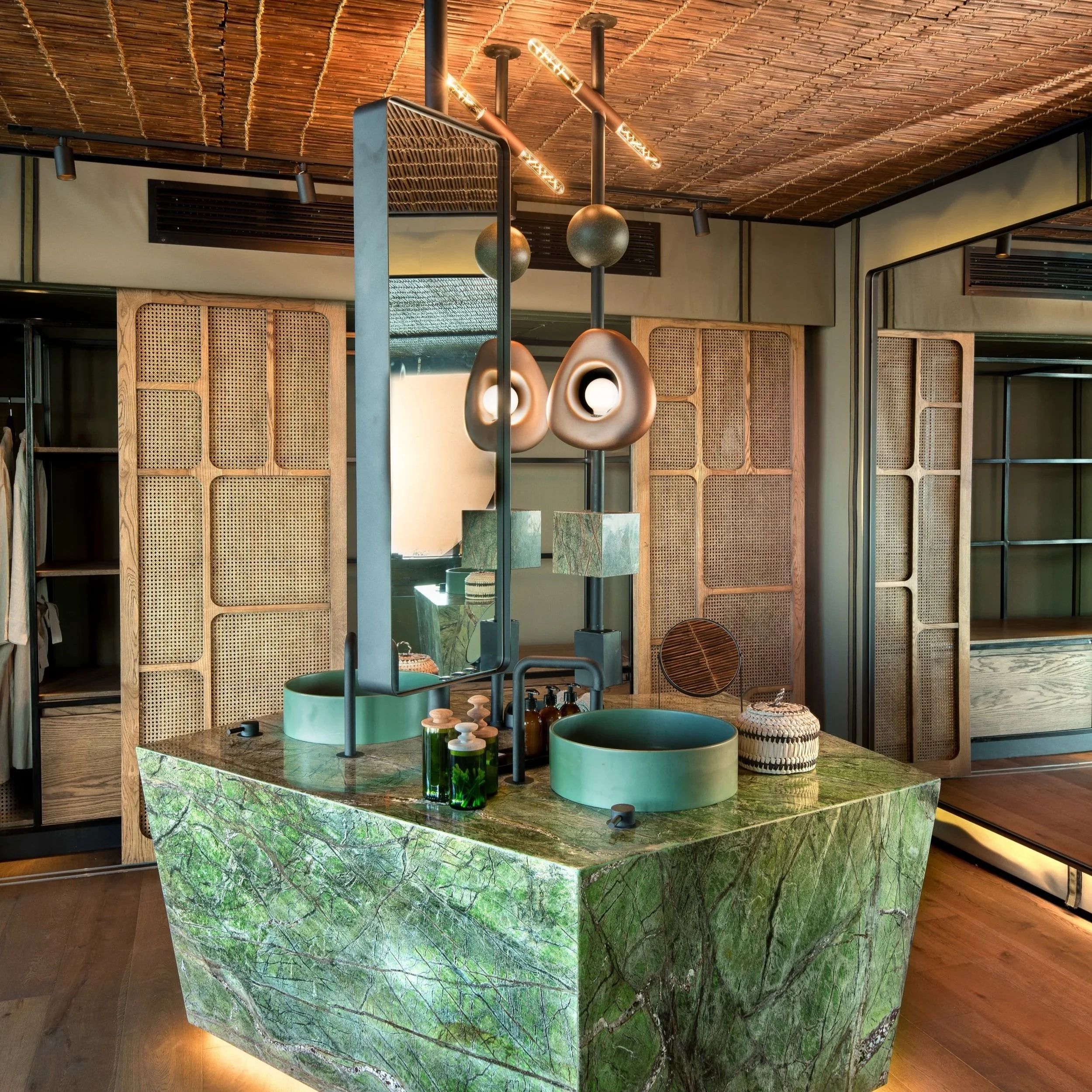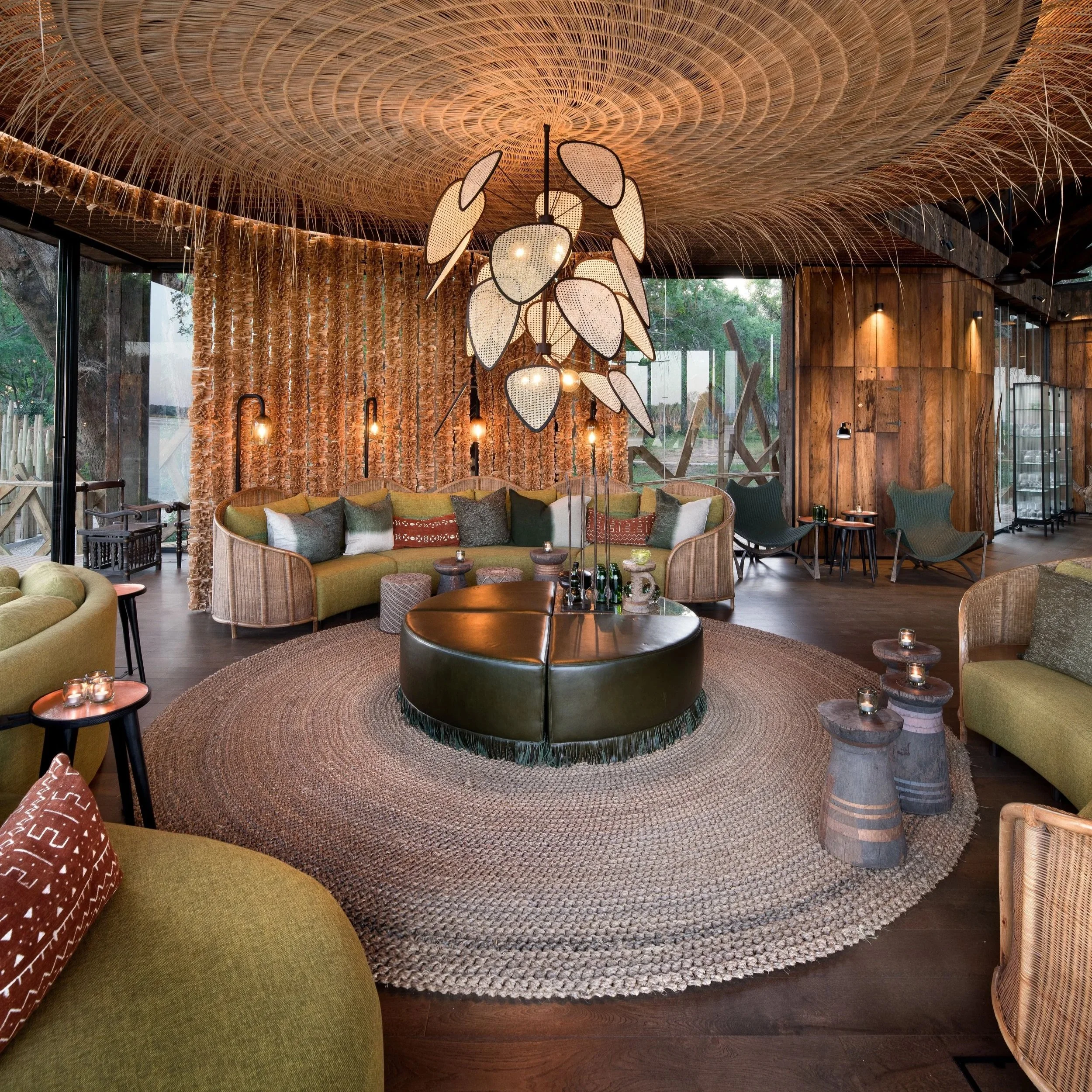 For the interiors, Kaonde tribal stools provided graphic inspiration. Copper, for which Zambia is well known, and Zambian basket weave inspired rattan and cane, mid-century furniture shapes. Contrasting shades of riverine inspired palettes, textures and accessories celebrate all that Zambia has to offer. We worked closely with local artisans in creating the custom woven pieces throughout the lodge. Fish scales, crocodiles and bird motifs and Zambezi tribal elements provide a sense of authenticity to the design.